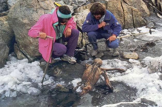 In September 1991 Alps borders weren't topical. The Baltics were newly independent. The USSR would be dissolved by xmas. Cartographers were looking at other things, but then human remains were found on the east ridge of Fineilspitze in the Ötztal Alps. The corpse had emerged from a receding glacier. The following day a hutkeeper and local gendarme went up to chip the body out. It was leathery but intact. They thought it might be from the 19th century; alpinism was newly fashionable then. Bad weather interrupted the recovery, and two days later Hans Kammerlander(!) and Reinhold Messner(!!) visited the site. I love this photo of them squatting with the dignified, fragile mummy. Alas, poor Yorick!