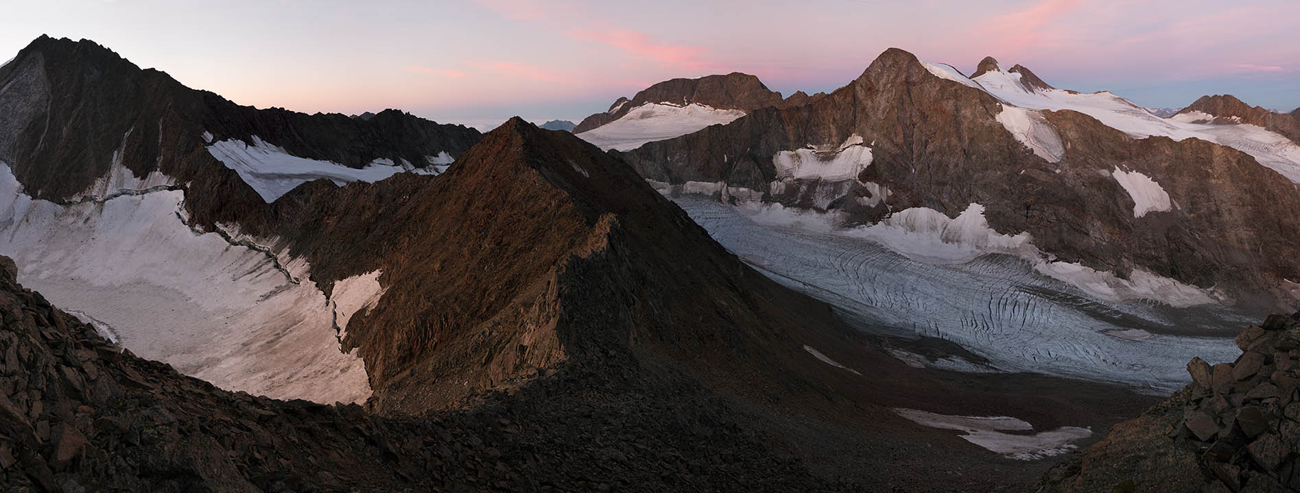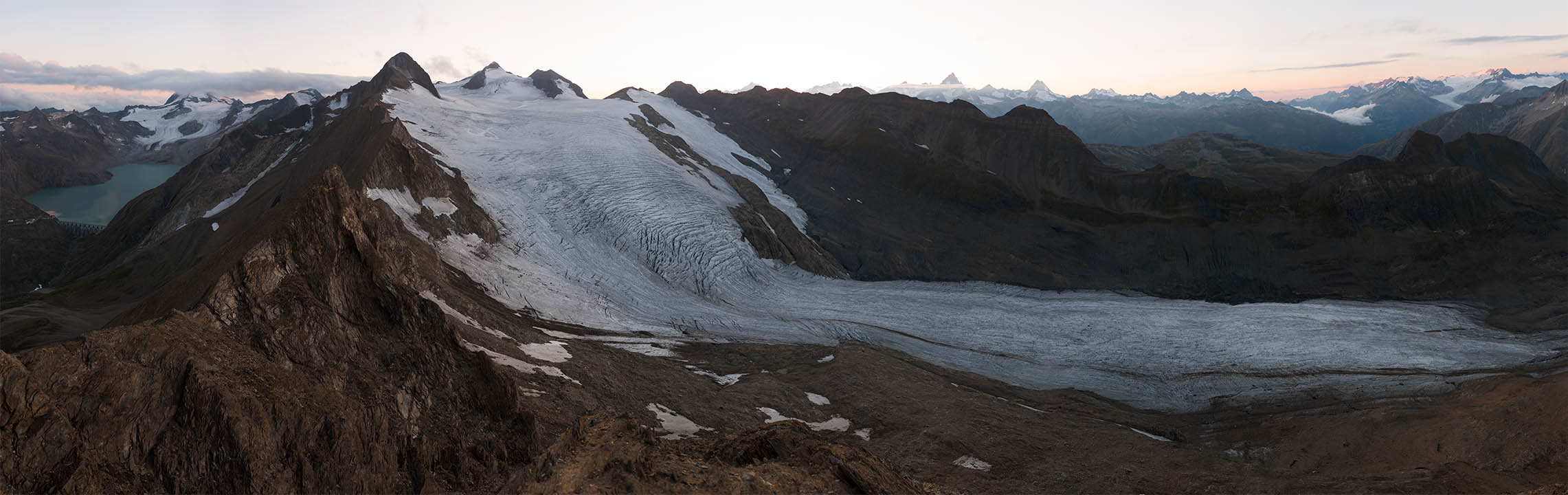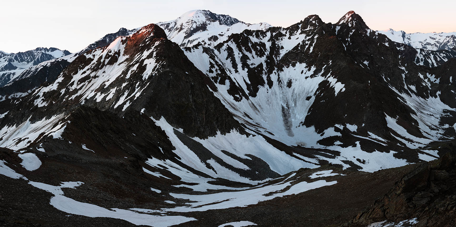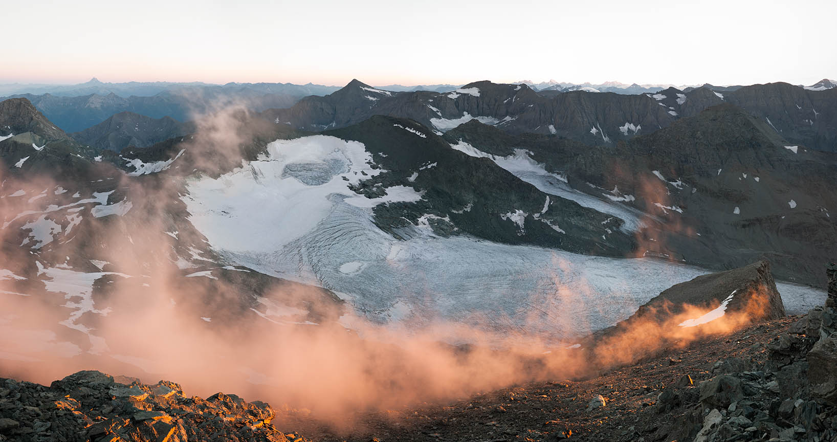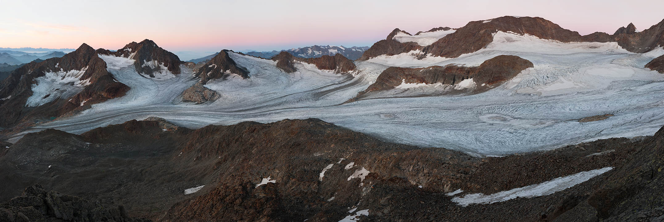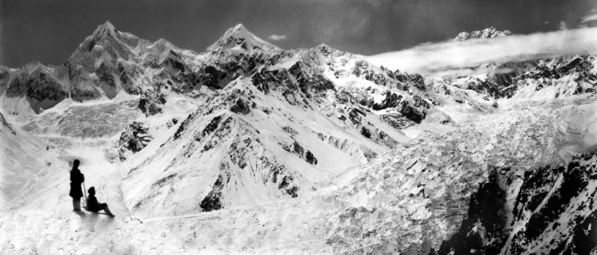 Unlike Sella’s glass plate contact prints, these works are large and colourful. Built from dozens of hi-res captures, they’re as related to Google Earth's contiguous satellite tapestries. They tilt skywards and into valleys. They pan up to 200˚ yet can pass as “straight”. They’re impossibly vast for traditional photographic looking. Some are actually reduced to exhibition scale. I see them as virtual contact prints. From a distance they’re expansive. Up close they’re startlingly intricate. Thes works are for leaning into as well as stepping back from.They're for being disoriented when tiny mountaineers or a bivouac reset the scale abruptly.