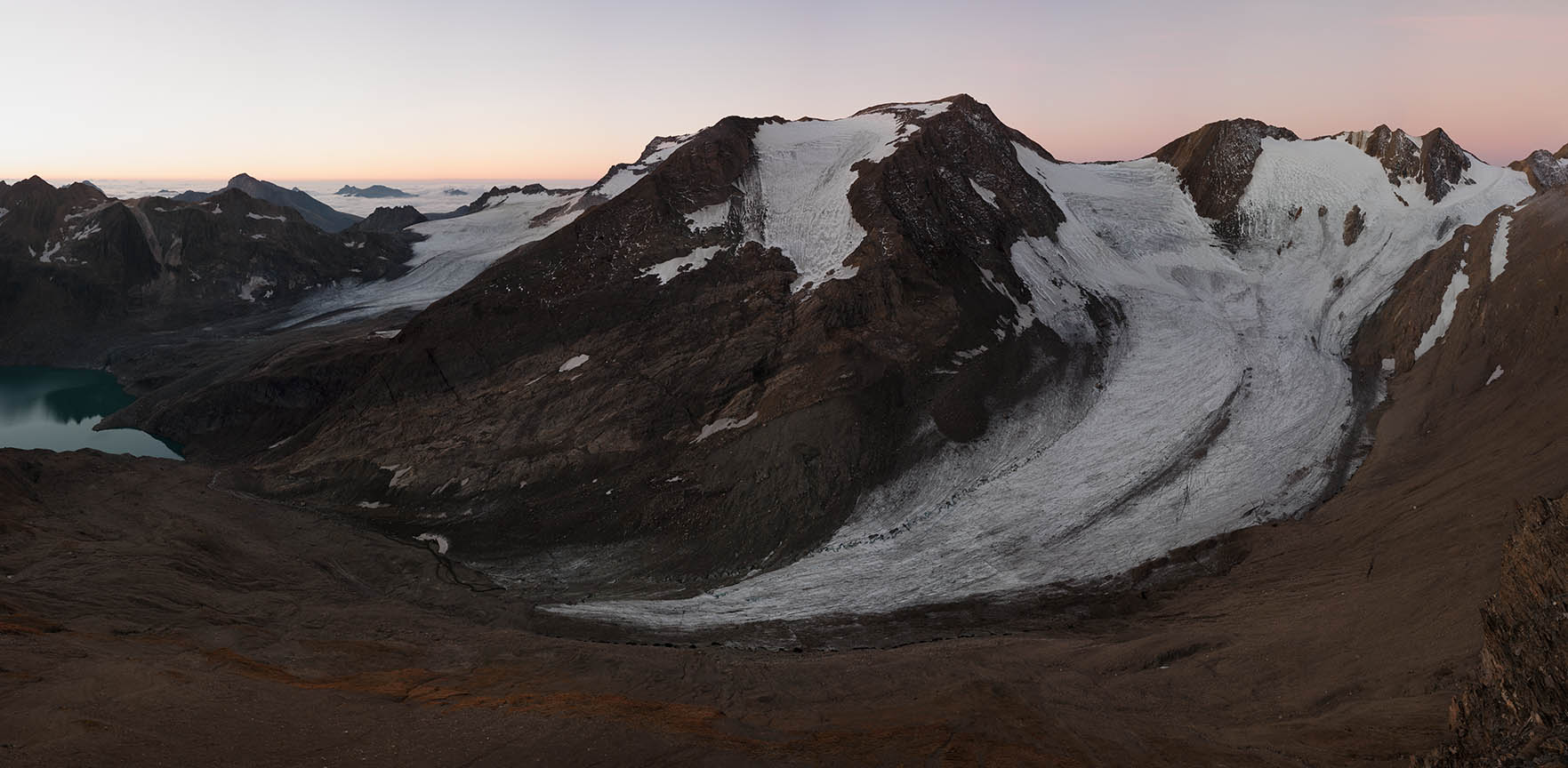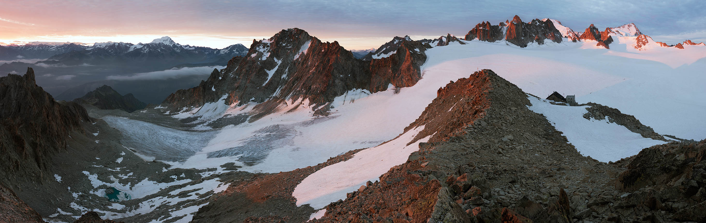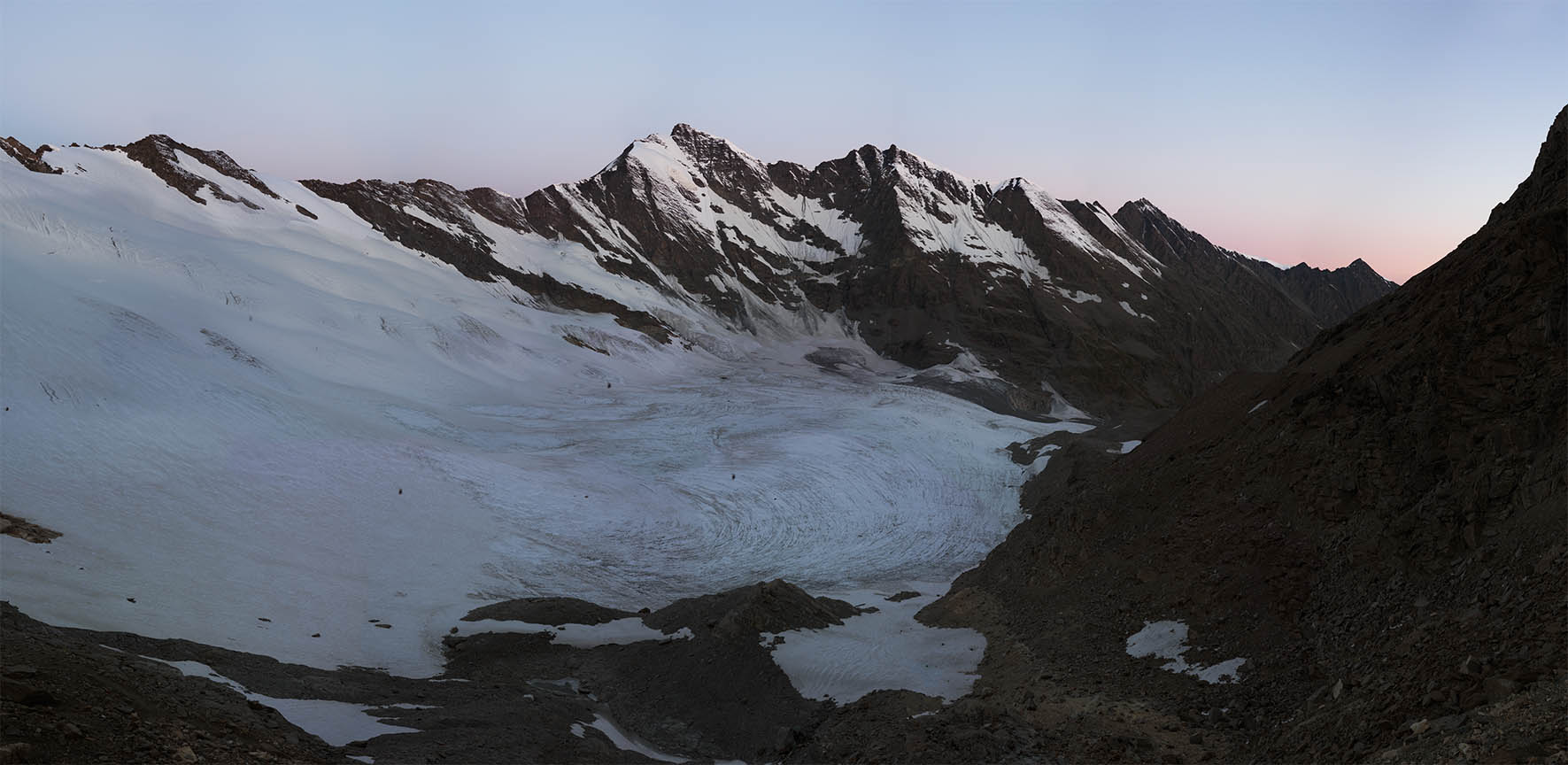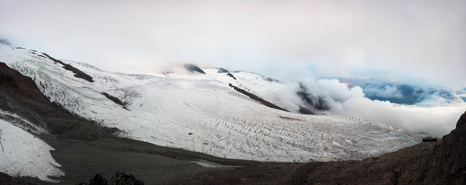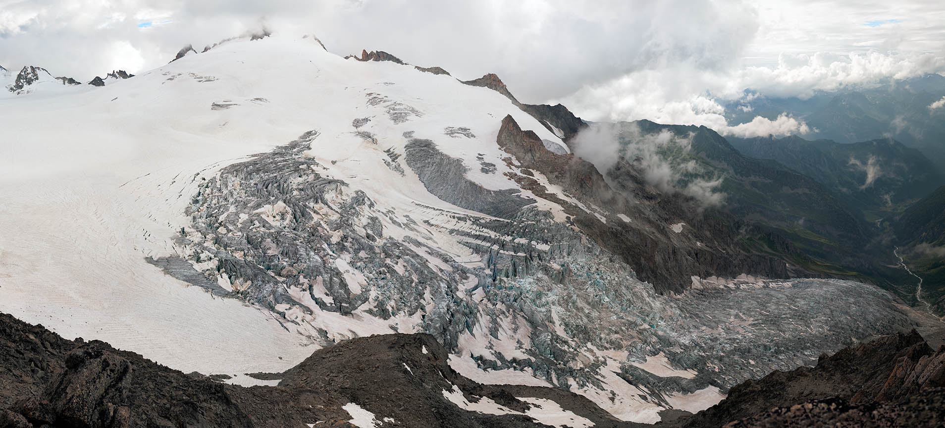 Unlike Sella’s glass plate contact prints, these works are large and colourful. Built from dozens of hi-res captures, they’re as related to Google Earth's contiguous satellite tapestries. They tilt skywards and into valleys. They pan up to 200˚ yet can pass as “straight”. They’re impossibly vast for traditional photographic looking. Some are actually reduced to exhibition scale. I see them as virtual contact prints. From a distance they’re expansive. Up close they’re startlingly intricate. Thes works are for leaning into as well as stepping back from.They're for being disoriented when tiny mountaineers or a bivouac reset the scale abruptly.